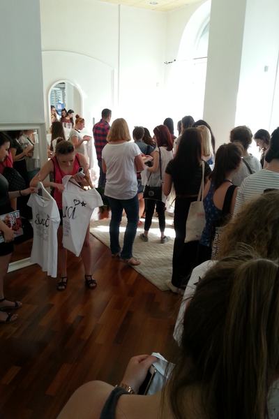 A másik, hogy az ingyen póló elég húzóerő és aki odamegy, bemond valami hülyeséget és boldogan hordja a "What happens in Hejőkeresztúr, stays in Hejőkeresztúr" feliratú pólót. Ráadásul a Facebook-eseményre is csak alig 180-an jeleztek vissza, és tapasztalatból tudjuk, hogy ha 3 ezren beikszelik, hogy elmennek egy bulira, akkor jó, ha 100-an tényleg ott vannak. Egyik jóslatom se jött be: ugyanis amikor fél 5 körül odaértem a 3-kor nyitott üzletbe, némelyik póló már készlethiányos volt és ilyen sor fogadott: