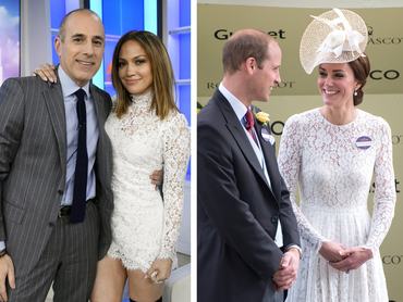 Jennifer Lopez márciusban, Katalin júniusban választott hosszúujjú, fehér, csipke Dolce & Gabbana ruhát, előbbi a The Today Show-ban villantott lábat a merész miniruhában 2016. március elsején, utóbbi pár napja vonult fel az ascoti derbin. A csipkés ruhához fekete Giuseppe Zanotti csizmát választott. Katalin ugyanúgy Dolce & Gabbana ruhát visel, ugyanúgy hosszúujjú, fehér csipke, mégis teljesen más az összhatás (és a szoknya hossza) – a hercegné elegáns, mint mindig. Önnek melyikük tetszik jobban?