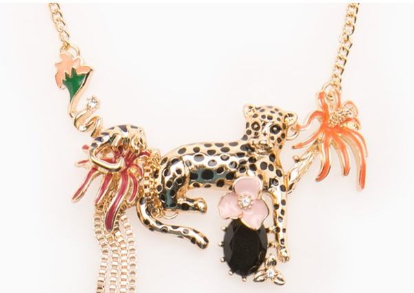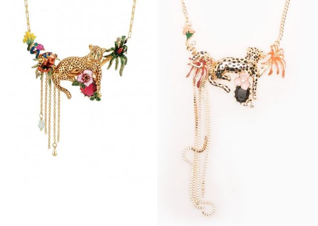 Mindkét láncon egy virágok közt fekvő leopárd látható, de tagadhatatlan, hogy a gazdagon kidolgozott és tulajdonképp giccses ékszereiről ismert Les Néréides lánca sokkal szebb, mint a Stradivariusé: élénkebbek a színek, kidolgozottak a részletek. Megkerestük a Les Néréides-et, azt válaszolták, jogi lépéseket tesznek minden esetben, ha hamisítás jön szóba. Szóval ha megtetszett önnek a Stradivarius alig ezer forintos verziója, csapjon le rá gyorsan, ki tudja, mikor szedik le a polcokról. Egyébként a Les Néréides jogi osztályának jó sok munkája lehet, ugyanis az Aliexpress is tele van koppincsokkal, 10 és 70 dollár közé beárazva – ide most nem teszünk linket, mert hamisítványt vásárolni nem szép dolog!