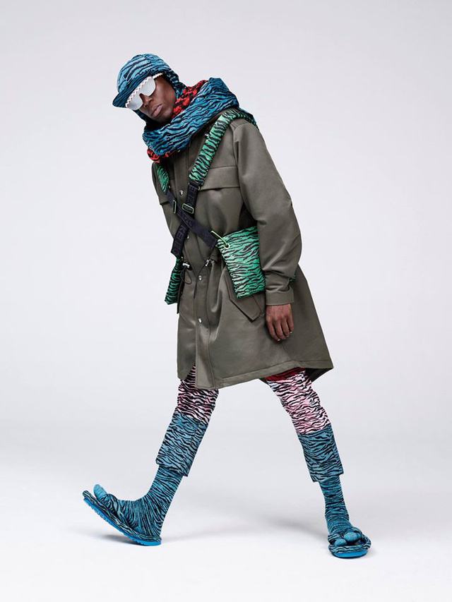 A férfiaktól is bátorságot követel a kék tigrises papucs és zokni kombinációja. A modell Oko Ebomb, a zöld parka szőrmés gallérja lecsatolható, a mintás nadrág pedig farmeranyagból készült.