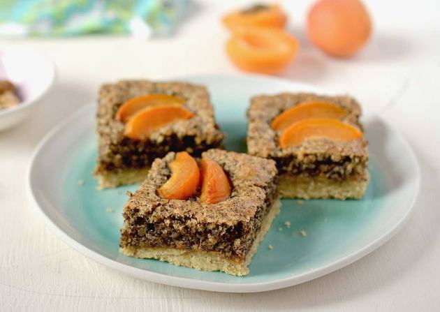A szaftos, édes sárgabarack nagyon jó párost alkot a mákkal – ez a kettős az alapja ennek a pitének is. Egy réteg omlós tésztára könnyed mákos-diós hab kerül, erre pedig sárgabarack-szeleteket sorakoztatunk. Meggyel is nagyon jól működne még!
