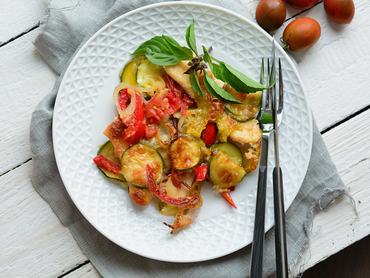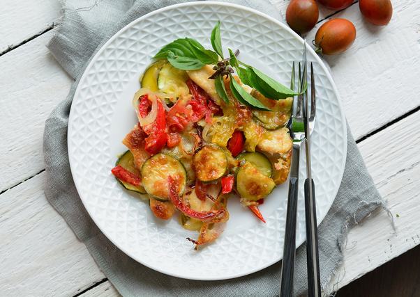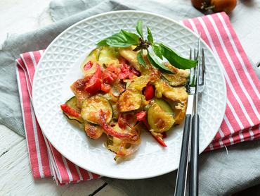 Ha már egyszer ennyi csodás friss zöldség van nyáron, használja ki, és süsse meg a hús mellett! Így egyszerre elkészül a csirke és a köret is, ráadásul a kalóriák miatt sem kell aggódnia. A zöldségeket és az elősütött hússzeleteket akár előző este is összekészítheti, aztán elég 30 perc alatt másnap megsütni.