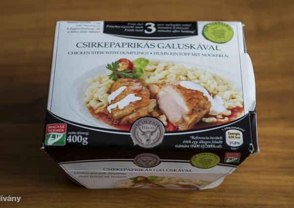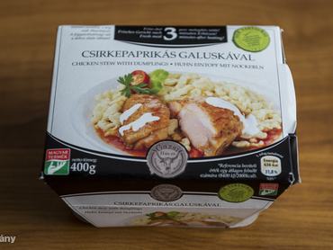 Összetevők: Galuska (43%) (búzaliszt, víz, tojás), Csirkepaprikás (57%) (csirke hús (25% készételre vonatkoztatva), víz, tejföl (pasztőrözött tejszín, kultúra), lecsó (víz, paprika, sűrített paradicsom, cukor, étkezési só, sűrítőanyag: módosított kukoricakeményítő), napraforgó étolaj, vöröshagyma, fűszerek (fűszerpaprika, fokhagyma, köménymag))