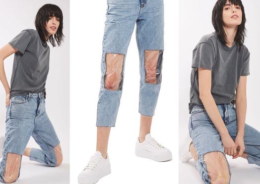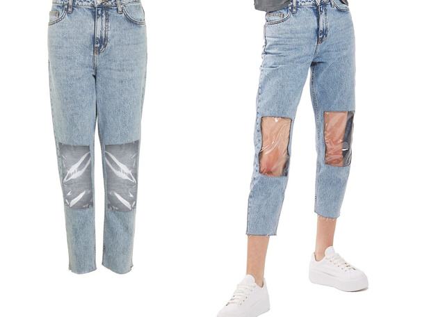 A Nordstromon futott bele a Twitter népe a szezon egyik legextrémebb gatyájába, egy Topshop farmerbe és rögtön ki is borultak – írja a Refinery29. Őszinte leszek: szerintem vicces a műanyag térdű, objektíve baromi ronda mamifarmer. Mármint jól vicces. Hatalmas divat a kivágott térdű farmer már szezonok ótra, adta magát, hogy valakinek eszébe jusson, hogy a térnél szellős gatyákat egy áttetsző fóliával fedje be.