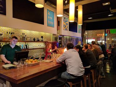 Úgy tűnt, a turisták körében nagyon népszerű. Élő jazz zene szólt csütörtök este kilenckor, és már csak a bárpultnál jutott nekünk hely. (Előre helyet foglalni tehát kötelező!) A személyzet nagyon profi, a kiszolgálók mosolygósak és segítőkészek, ha pedig igényeljük a mesét is a borok mellé, már érkezik is a szakavatott sommelier akitől mindent megtudhatunk.