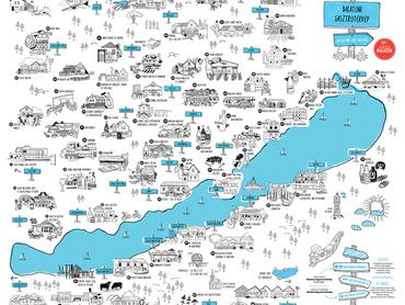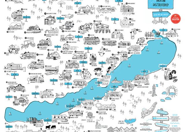 - Az, hogy igazából nem térkép: Olyannyira nem, hogy a kiadványra is felkerült a szöveg – "Figyelem! A térkép elrendezése eltér a valóságtól! Kérjük, mielőtt elindultok, nézzétek meg a pontos címet!". Bár első ránézésre még térképnek tűnik a hatalmas Balaton miatt, de domborzat, utak, távolságok nincsenek feltüntetve. A vendéglátóhelyeket a térben elég nagyvonalúan szétdobált grafikák jelölik, elhelyezkedésük köszönőviszonyban sincs a valósággal. Szóval csak látszólag térkép, gyakorlatilag egy aranyos rajz egy hatalmas papíron, a hátoldalán – egy amúgy abszolút informatív – listával a helyekről, címükről, nyitva tartási idejükről. Én inkább a balatoni gasztrolistának hívnám, de kétségtelenül az nem olyan fancy, mint a térkép. Kérdeztem egyébként a készítőket, hogy miért nem akartak praktikus térképet adni a turisták kezébe, amin esetleg azt is lehet látni, hogy pontosan hol vannak egymáshoz képest az éttermek. Azt a választ kaptam, hogy inkább egy azonnal felismerhető, szerethető, figyelemfelkeltő kiadványt akartak csinálni, és nem fért volna el ez a sok hely egy térképen úgy, hogy a dizájn se szenvedjen csorbát. Mondjuk ettől továbbra sem értem, miért nem lehet valami egyszerre szép és hasznos, de mindegy. Így néz ki egyébként: