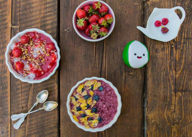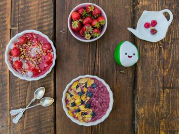 A smoothie bowl a zöldség vagy gyümölcsturmix kanalazható változata, sűrűbb, pépes alappal, ami friss gyümölcsökkel, pelyhekkel, morzsákkal, granolákkal, magokkal együtt teljes értékű fogást ad. Színezésben, ízesítésben a lehetőség határtalan, de ha gyerekekről van szó, más ételeknél is inkább azt láttam, hogy nem fontos majálist szerveni a tányérjukra, a szürreális kompozíciók, virágok és nanohabok helyett egy vezető íz és némi díszítés jobban beválik, és ez ebből a szempontból egyszerűbb és szülőbarát, és az aznapra előirányzott vitaminadag egy része ternészetes forrásból meg van oldva.
