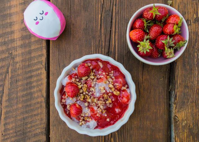 Elkészítés: Egy kis előkészületre szükség lesz. A tápiókát főzés előtt legalább egy órára be kell áztatni, de ha elúsztunk és nem maradt rá idő, nem bosszulja meg magát, csak tovább tart a puhulási ideje és több folyadék kell hozzá. A tápiókát növényi tejben nem sűrűre, hanem lehetőleg minél lazábbra főzöm, egy kis szirupot keverek hozzá. Melegen osztom szét két tálba, mert ha kihűl, pudingossá szilárdul. Az epret megtisztítom, néhány szemet félreteszek díszítésnek, nagy részét pedig leturmixolom, majd felét-felét a langyossá hűlt tápiókához keverem. A tálakat egy időre hűtőbe teszem. A sütőt 190 Celsius fokra állítom. A mandulát tiszta konyharuhába csomagolva a vágódeszkára lapogatom, és a mozsár botjával összetöröm. Egy keverőtálban a mandulatöretet öszekeverem egy kis kókuszvajjal és minimális sziruppal, vanília esszenciával, majd egy pizzasütő tálon, vagy sütőpapírral bevont sütőtálcán szellősre rendezgetve 5-7 percre beteszem sülni. Ha elkészült és kihűlt, megszórom vele a kompozíciót.