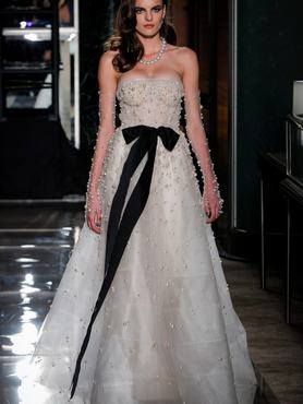 Az egyik legváratlanabb trend kétségtelenül a feketével kombinált menyasszonyi vonal. Persze nem a sötét szín uralja a ruhát, csak finoman jelenik meg egy vékony masni vagy szalag formájában, többek között a Reem Acra, Carolina Herrera vagy a Marchesa kínálatában. Utóbbi miniben, koktélruha fazonban dobná piacra a szokatlan párosítást.