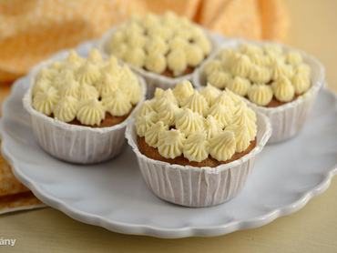3. A nedves hozzávalókat a lisztes keverékkel összeforgatjuk. Egy muffintepsit kibélelünk kapszlikkal, és a mélyedésekben elosztjuk a tésztát. A muffinokat 180°C-ra előmelegített sütőben kb. 20 perc alatt megsütjük, tűpróbával ellenőrizzük, átsültek-e. Hagyjuk szobahőmérsékletűre hűlni.