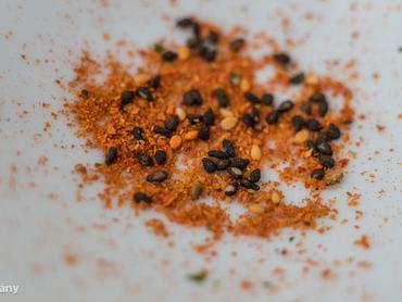 Ez itt nem más mint egy hagyományos japán hétfűszer keverék, a togarashi. Pirospaprikából, sancho borsból, pirított naracshéjból, fekete és fehér szezámmagból, algából és gyömbérből készül.