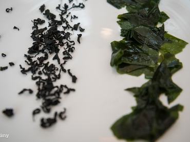 Ez itt a wakamé, ami valójában ehető hínár, egy tengeri algafajta, és szárítva kapható. Elég csak néhány percre beáztatni és mehet is levesbe, salátába.