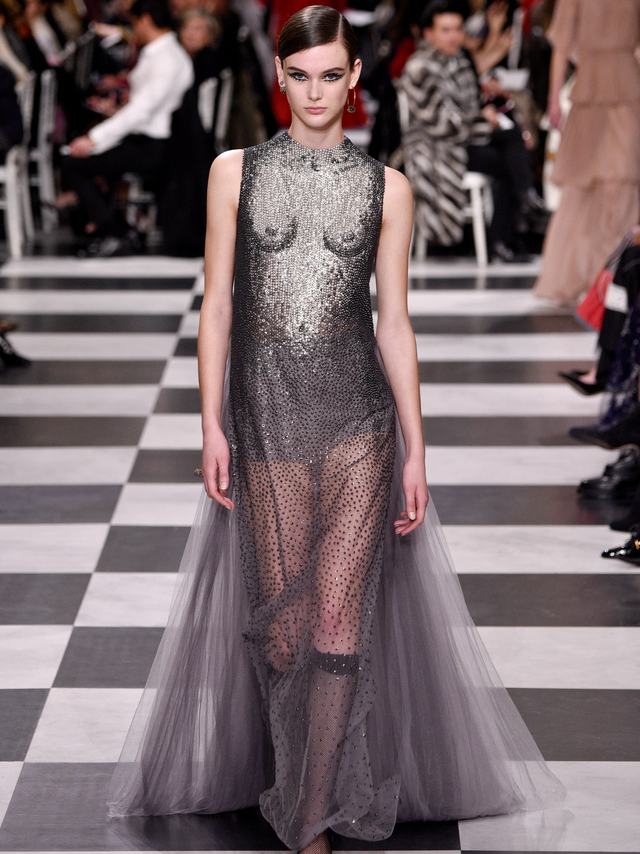 Ahogy arról nemrég beszámoltunk, az idei haute couture divathéten is szép számmal mutattak be áttetsző estélyiruhákat a divatházak. A Dior szépen egyensúlyozott az elegáns fekete-fehér, illetve a pucérruhák világában, kollekciójának egyik legérdekesebb darabja mégis az a Magritte festményre emlékeztető, optikailag csalóka pucérruha lett, amit 600 órán át készítettek a francia divatház szakemberei. A meztelen női felsőtest látványát keltő ruha áttetsző anyagára több ezer különböző árnyalatú és vastagságú flittert applikáltak amivel valóban sikerült elérniük a trompe-l'oeil hatást.