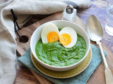 Egy kevés, kb. 1 dl vizet is adhatunk hozzá, de általában nem kell. Felöntjük a tejszínnel, felforraljuk, levesszük a tűzről, és botmixerrel simára dolgozzuk. Főtt tojással tálaljuk.