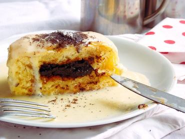 A tűzről épp levett, forró cukros-vajas tejbe (minimum másfél centi legyen a folyadékszint) először beleengedünk egy kör alakú sütőpapírt, majd belehelyezzük a gombócokat, a tetejüket is meglocsoljuk a tejjel, a lábast szorosan lefedjük, és 30 percre betoljuk a forró sütőbe.