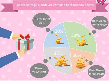 A jegyesek többsége a pénzen kívül tárgyi ajándékot is vár a násznéptől, és mindössze minden harmadik pár elégszik meg a készpénzzel, és 100 lakodalomból csak 5-nél nem kérnek semmilyen ajándékot a vendégektől. A házasulandók harmada 10 és 20 ezer forint közötti összeget remél egy-egy meghívottól, 20 százalékuk még ennél is többet, akár 30 ezer forintot is, viszont szintén 20 százalékuk megelégszik 10 ezer forinttal vagy annál kevesebbel is. Ilyenkor is érvényesül az adok-kapok elv: ha olyan embert hív meg a pár az esküvőjére, akinek ő maga is részt vett a lakodalmán, akkor tízből hatan elvárják, hogy nagyságrendileg akkora értékű ajándékot kapjanak, mint amekkorát korábban ők adtak.