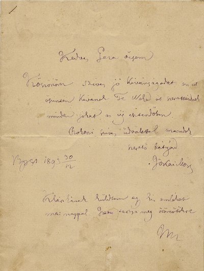 Jókai Mór egyik kézzel írt levele 1893-ból