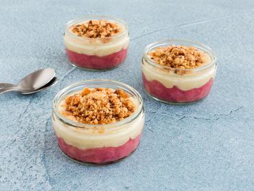 A krémes réteghez verd fel a tejszínt, add hozzá a joghurtot és a cukrot, majd rétegezd a tejszínes krémet a birssel. A tetejét díszítsd pirított mogyoróval és kekszmorzsával.