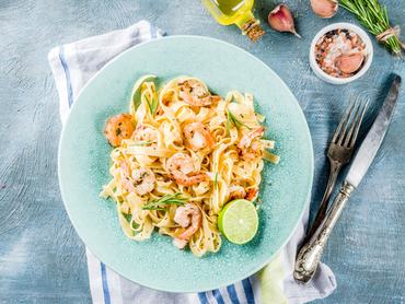 A garnéla kevés zsírt és energiát tartalmaz, sok benne a fehérje, a vas és a B12-vitamin – még egy adag egészséges ómega-3 zsírsav is található benne. Ebben a fogásban egy jó adag tejszínes raguként kerül az asztalra, amit – ha van otthon – egy kevés kapribogyóval és kukoricával is feldobhatsz.
