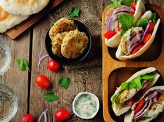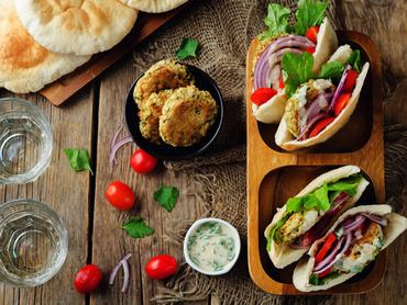 Töltsd meg a pitákat a meleg falafellel, a hideg joghurttal, ízesítsd az egészet friss zöldségekkel, a krémes hummusszal, és már el is készültél.