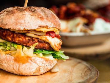 A zsömléket pirítsd meg a grillen, majd tölsd meg őket a vega fasírtokkal, a szósszal, a sajttal és a zöldségekkel.