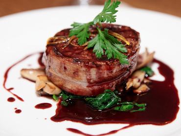 szűzpecsenye vörösáfonyás gombaraguval és hercegnő burgonyával