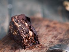 Melegítsd elő a sütőt 170 fokra. A vajat, a vaníliakivonatot és a cukrot egy mély tálban keverd habosra. A csokoládét vízgőz felett olvaszd fel egy hőálló tálban, és amikor felolvadt, add hozzá a kávét. A tojásokat verd fel egy kicsit és nagyjából öt adagban add a habosra kevert vajhoz és alaposan dolgozd el. Ezek után az olvadt csokoládét is keverd bele (már langyosan). A lisztet a sütőporral és a csipet sóval szitáld egy tálba, add hozzá az összevágott diót, majd forgasd össze az egészet a csokoládés masszával. Simítsd a tésztát a egy kisebb tepsibe/tortaformába, a sütőben 35 percig süsd, majd tedd hideg helyre.