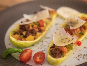 Ehhez nem kell konyhai gyakorlat: csak egy kis hagymával összesütöd a húst, beletöltöd a cukkinihajókba, és adsz neki egy fél órát. Ennyi idő alatt ráolvad a sajt, és a cukkini is tökéletes állagúra sül. Ideális életmódváltó vacsora, amivel egyáltalán nem érzed, hogy nagy áldozatokat kellene hoznod az egészség oltárán. Ha nem fontos, hogy vegán legyen, akkor egy-egy vékony szelet parmezánnal vagy grana padanóval küldd meg a tetejét.