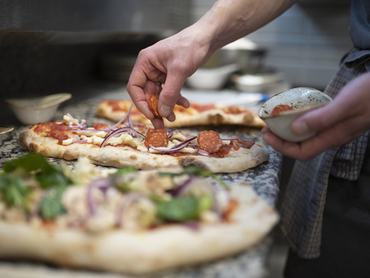 Futtasd fel az élesztőt a cukorral a vízben, majd ha ezzel megvagy, a hozzávalókat gyúrd rugalmas tésztává. Keleszd 1 órán át, majd nyújtsd fél centi vastagra, és hagyd még pihenni, amíg előkészíted a hozzávalókat. A kész pizza legalább 270 fokon süljön, így nemcsak hamarabb elkészül, de az állaga is sokkal jobb lesz. Ne süsd túl – ha vékony a tészta, 10 perc alatt elkészül a pizza ezen a hőfokon.