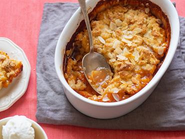 Forgasd össze a gyümölcsöket a keményítővel, cukorral, likőrrel, sóval és citromlével, majd kanalazd egy kivajazott jénai vagy szilikontepsi aljára. A tésztával is nagyjából ugyanennyi dolgod lesz: keverd el alaposan egymással a folyékony hozzávalókat és a puha vajat, majd egyenként dolgozd hozzá a mandulát, sütőport és a lisztet is. Kis kupacokban tedd a tésztát a gyümölcsös réteg tetejére, és 170 fokon úgy 40 perc alatt süsd készre. A tetejét sütés előtt barna cukorral is díszítheted. Langyosan vagy hidegen tálald.
