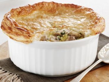 A vajban puhítsd meg kissé a hagymát, majd dobd a serpenyőbe a többi alapanyagot (a tésztán kívül). Ha összemelegítetted, kanalazd egy közepes jénaiba, helyezd rá a tésztát, kend be tojással, és 35 perc alatt süsd készre a forró sütőben. Langyosan, pirított kaláccsal tálald.