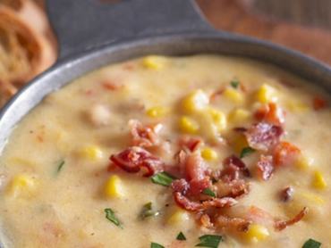 Süsd meg kissé a baconkockákat, majd add hozzá a kukoricát, és annak is adj 2-3 percet. Öntsd fel az alaplével, és ha felforrósodott, keverd hozzá a tejszínt, mascarponét, fűszerezd, és a hagymával a tetején tálald.