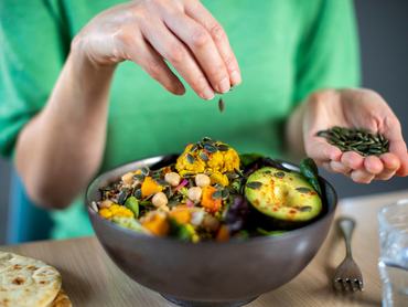 Forgasd meg a karfiolt, cukkinit és a csicseriborsót a forró, fokhagymás vajban. A többi hozzávalót dolgozd össze alaposan, majd add a keverékhez. Tálald a salátát a friss zöldfűszerekkel a tetején.