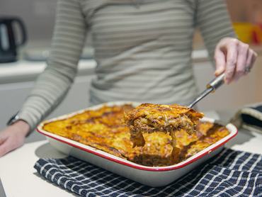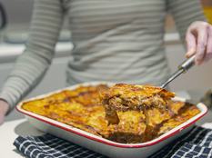 Rétegezd a tésztát a hússal, és süsd fél órán át a sütőben.