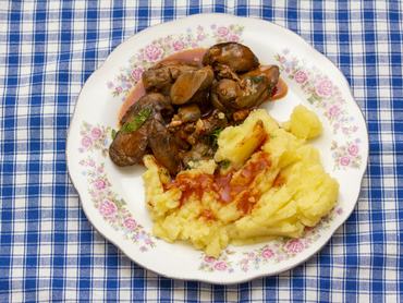 Pirított csirkemáj baconnel és aszalt szilvával