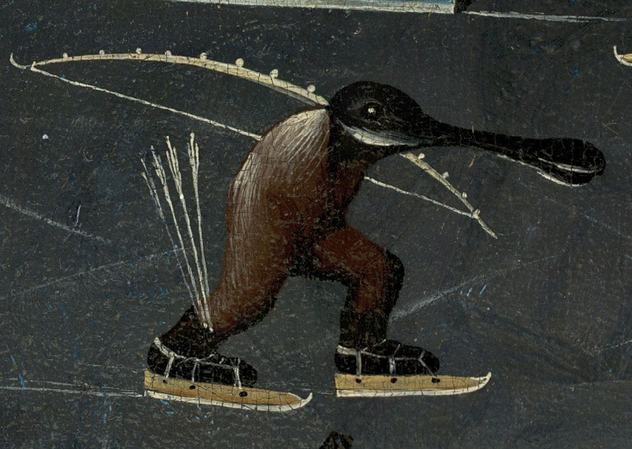 Bosch képein démoni figurák jelennek meg, gnómok és szörnyek, hal-, madár-, disznó- és ragadozófejjel ábrázolt emberi testek. Ezek a lények kínozzák az embereket például A pokolba vezető folyó című képen is: az izzó folyóban emberek fuldokolnak, miközben egy macskafejű démon üldözi őket, a parton pedig hasonló, rémálmokban és hallucinációkban megjelenő