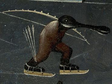 macskafejű, embertestű, békalábú, szárnyas társai gyötörnek meztelen embereket.