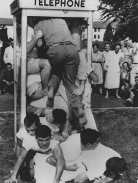 Az ötvenes években sem kellett messzire menni a népszerű, ám túl sok értelemmel nem bíró időtöltésekért. A kihívás valószínűleg nem a klausztrofóbiások körében számított a legnépszerűbbnek: egy-egy kiválasztott telefonfülkébe kellett minél több embernek bezsúfolódni. A leginkább brit és amerikai kamaszok között hódító „versenynek” többféle változata létezett; egyes egyetemi campusokon csak akkor nyerhettek, ha mindenki teljesen bent volt a fülkében, máshol megengedték, hogy a végtagok kilógjanak. Angliában az a csapat nyerhette el a győzelmet, amelyik képes volt a végén sikeres telefonhívást kezdeményezni. A versenyzők elszántságához egyik esetben sem férhetett kétség: sokan böjtöltek, hogy minél vékonyabbak legyenek a kihívás idejére, mások a rongálástól sem riadtak vissza: feldöntötték a fülkéket, hogy minél többen férjenek bele: állítólag 25-40 fő belepréselődése már szép eredménynek számított.