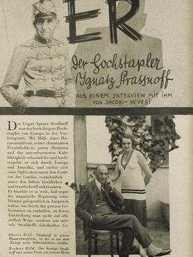 Egyik leghíresebb kalandja során Strassnoff magát Esterházy-hercegnek kiadva kért bebocsáttatást az esztergomi hercegprímáshoz, akinek sírva előadta, hogy óriási kártyaadósságba keveredett, és önkezével fog véget vetni az életének, ha nem tudja rendezni a tartozását. A hercegprímást meghatotta a könyörgés, a szélhámos pedig vastagon megtömött pénztárcával távozott Esztergomból.