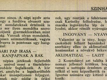 A Színházi Élet megemlíti, hogy Kosztolányiék várják az olvasók palindromjait, a következő lapszámban már olvashatunk is ezekből egy csokorra valót, például ezt az egész hosszút: Anya, te sáfrány! Nyárfás e tanya! Hogy ez mennyire értelmes, más kérdés. Újabb hét elteltével nem lankad az olvasók játékkedve: