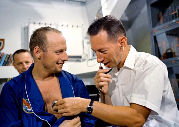 A szkafander felvétele után az orvos kíséretében az űrhajósok autóval utaznak az indítóállomásig, ahol egészen az űrkapszula bejáratáig kíséri őket az űrorvos. Amíg az űrhajós az űrállomáson tartózkodik, addig az orvosa a földi irányítóközpontból kíséri figyelemmel a munkáját, és rendszeresen beszélnek egymással. A houstoni irányítóközpontban például mindig ül egy orvos a NASA hivatalos beosztása alapján. A missziók végén az űrhajósokat azonnal ellenőrzik az orvosok, és elvégzik a szükséges vizsgálatokat, majd következik a rehabilitáció.