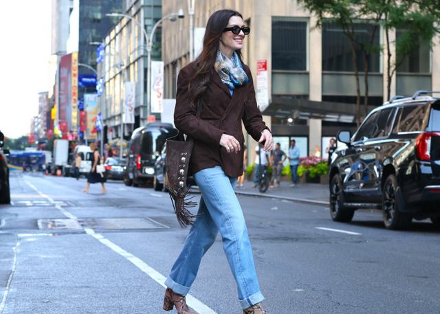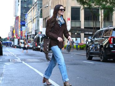 Hathaway itt a Levi’s farmerhez egy hasonló barna dzsekit kapott, mint amit az első részben is viselt, csak ez épp egy Ralph Lauren Purple Label darab. A kígyómintás csizma Zadig&Voltaire, a selyemsál Sabina Savage, a közel egymillió forintos táska Valentino Garavani, az ékszerei pedig a Marlo Laz, napszemüvege pedig az L.G.R. márkától származik.
