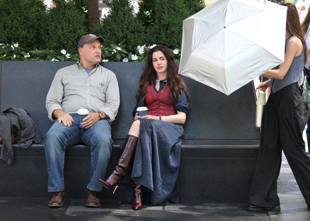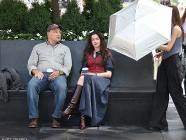 Anne Hathaway-n nem nagyon cserélgették az ékszereket, ez is ugyanaz a lánc (mármint nem a kétsoros Marlo Laz gyöngy, utóbbiról lentebb írunk), amit fentebb már említettünk, az eredetileg közel 400 ezer forintos mellénye egy Gabriela Hearst darab, míg a 370 ezer forintos csizmáját a Paris Texas márka kínálatában kell keresni.