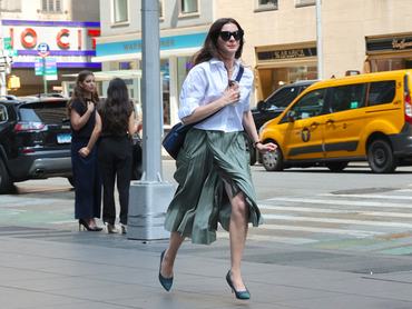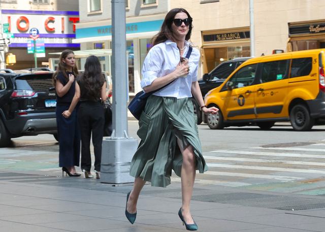 Anne Hathaway itt ugyanazt a nyakláncot viseli, mint fentebb, a napszemüveg viszont egy Oliver Goldsmith modell, az ing a TWP márkától van, a 250 ezer forintos szoknya Sacai, a cipő Gabriela Hearst.