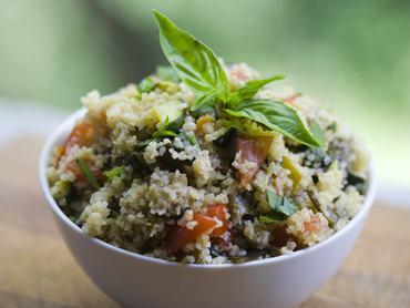 Forrázd le a kuszkuszt, majd lefedve tedd félre negyedórára. Ha langyosra hűlt, egyszerűen forgasd össze a többi alapanyaggal, majd fűszerezd és hidegen tálald.