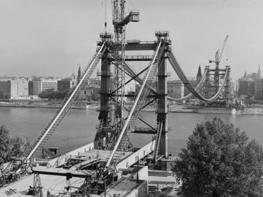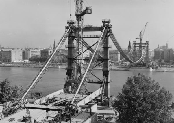 A földmunkagépek első dörrenése 1961-ben visszhangzott a rakpartokon. A városlakók eleinte idegenkedve figyelték a munkálatokat. Hogyan pótolhatná bármi azt az eleganciát és történelmet, amit az eredeti Erzsébet híd jelentett? Ám ahogy az acélkábelek felkerültek, és a betonpillérek az ég felé törtek, a két part ismét közeledni látszott egymáshoz. Az átadás határideje 1964. november 7-e volt, a „nagy októberi szocialista forradalomnak” nevezett oroszországi bolsevik puccs évfordulója, ami akkoriban Magyarországon is piros betűs nap volt.