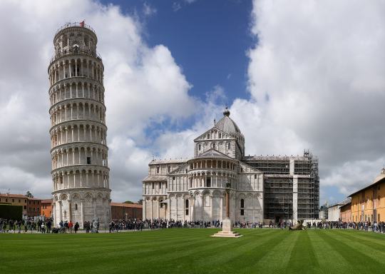 Az 55,86 méter magas és 14 700 tonna becsült tömegű pisai ferde torony jelenleg délkelet felé dől, ennek szöge 3,97 – utóbbi adattal mégsem ez a világ legferdébb épülete.