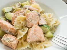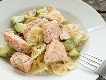 A tésztát főzd ki lobogó, sós vízben. A tejfölt keverd el a mascarponéval, a narancs héjával, levével, a sajttal, majd ízesítsd és tedd félre. A halat a fokhagymás vaj és olaj keverékében süsd ki, majd adj néhány percet a cukkininek is. Kockázd fel a halat, majd egyszerűn forgasd össze a hozzávalókat, és tálald a fogást melegen.