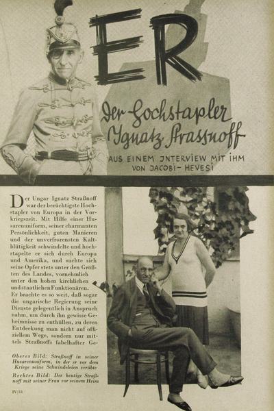 Előbbi városban, amikor tudomására jutott, hogy a hamburgi amerikai konzul Párizsban beteg lett, rögtön kihasználta az alkalmat a csalásra: „Strassnoff elegánsan kiöltözködve, sorra járta a konzulokat Robertson nejének hamisított levelével. A lady, utalással férje betegségére, kérte, hogy pillanatnyi pénzzavarának enyhítésére, férje hazaérkezéséig, két-háromszáz márkát előlegezzenek neki.