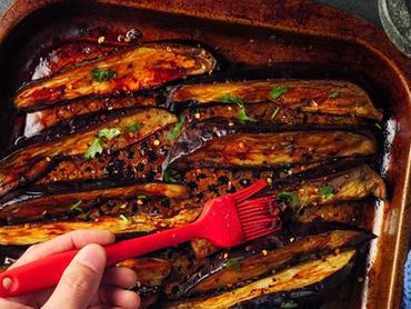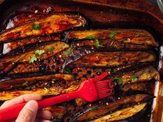 A padlizsánokat vágd fel hosszában, kissé olajozd meg, majd sózd és borsozd. A többi hozzávalót alaposan keverd el, grillezd meg a zöldség héjjal nem rendelkező oldalait, majd a páccal folyamatosan kenegetve süsd készre a padlizsánokat. A mogyoróval és kedvenc sajtoddal a tetején tálald.